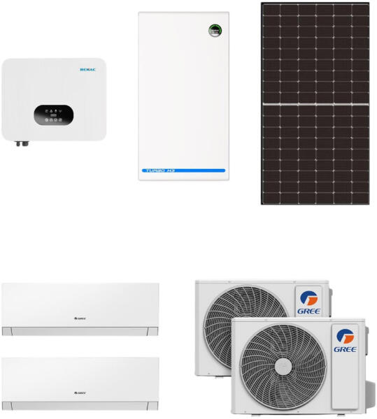 Ezt a terméket nem szállítjuk, csak személyes átvétel lehetséges! Cool4U Solar L csomag (28 db napelem, 10 kW inverter, 9,5 kW energiatároló és 2db 3,5kw klíma) A Solar L csomag egy komplett, korszerű otthoni energiarendszer: háromfázisú, hibrid Renac inverter (10 kW), nagyfeszültségű 9,5 kWh-s LiFePO4 akkumulátor, 28 db nagy hatásfokú Risen 420 Wp TOPCon modul és két darab, Wi-Fi-s Gree Smart One 3,5 kW klíma. A gyors (